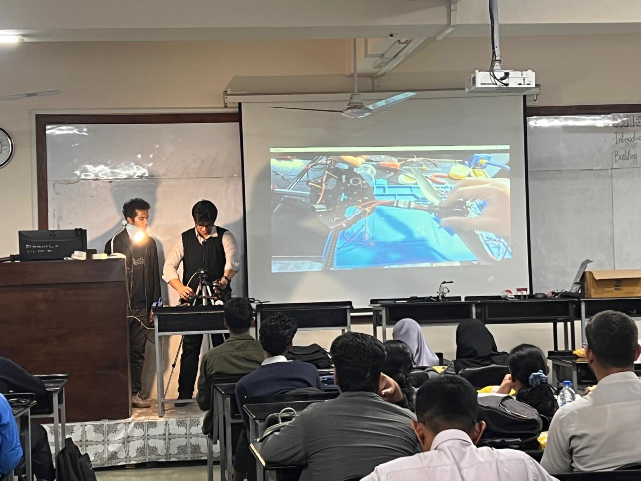 MIST Mavirov, a student-led research team under the supervision of the EECE Department, successfully concluded the "Introduction to Aerial Drone Building and Autonomous Flight” course, with a closing ceremony held today. A total of 63 students from various departments of MIST participated in this 4-day, hands-on and theory-based course, gaining practical experience in aerial drone construction and autonomous flight systems. The course culminated in a field test on the final day, where participants applied their knowledge through real-time flight operations.
